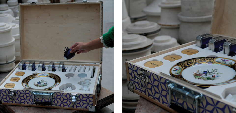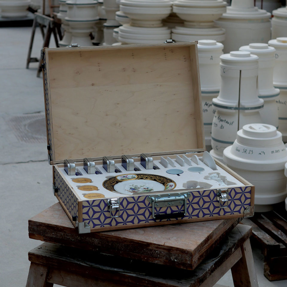 Cette valise incarne la manufacture de Sèvres hors-les-murs. Nous avons donc choisi des matières qui évoquent la minéralité de ses porcelaine, mais aussi le précieux de ses pièces.