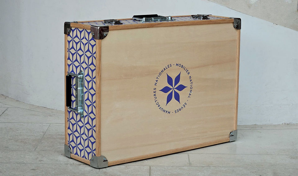 La structure de la valise en bois clair fait écho aux boites de transport d’œuvre d’art, tandis que les impressions en bleu viennent habiller la valise aux couleurs de Sèvres.